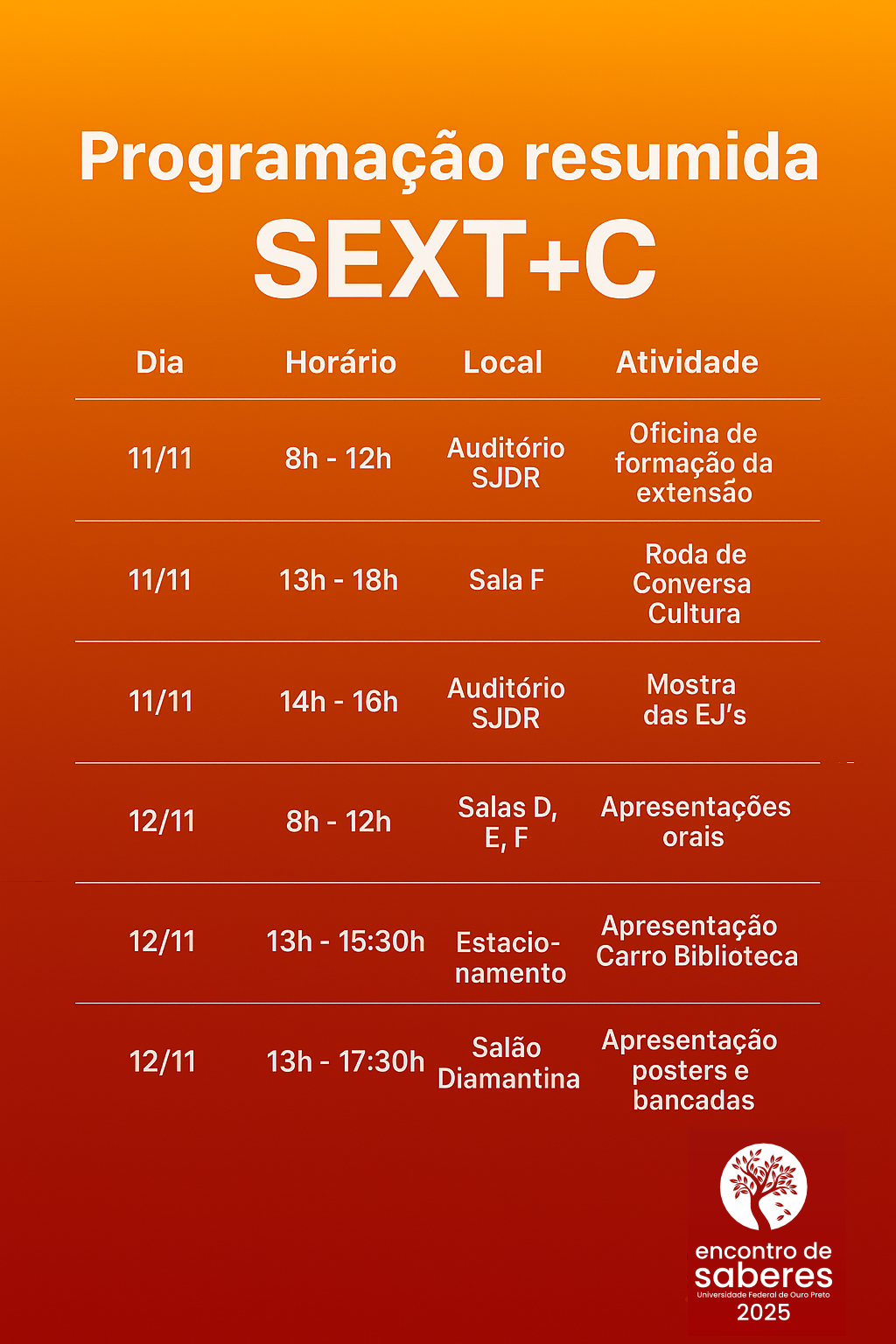 Confira na imagem abaixo a programação resumida do SEXT+C.