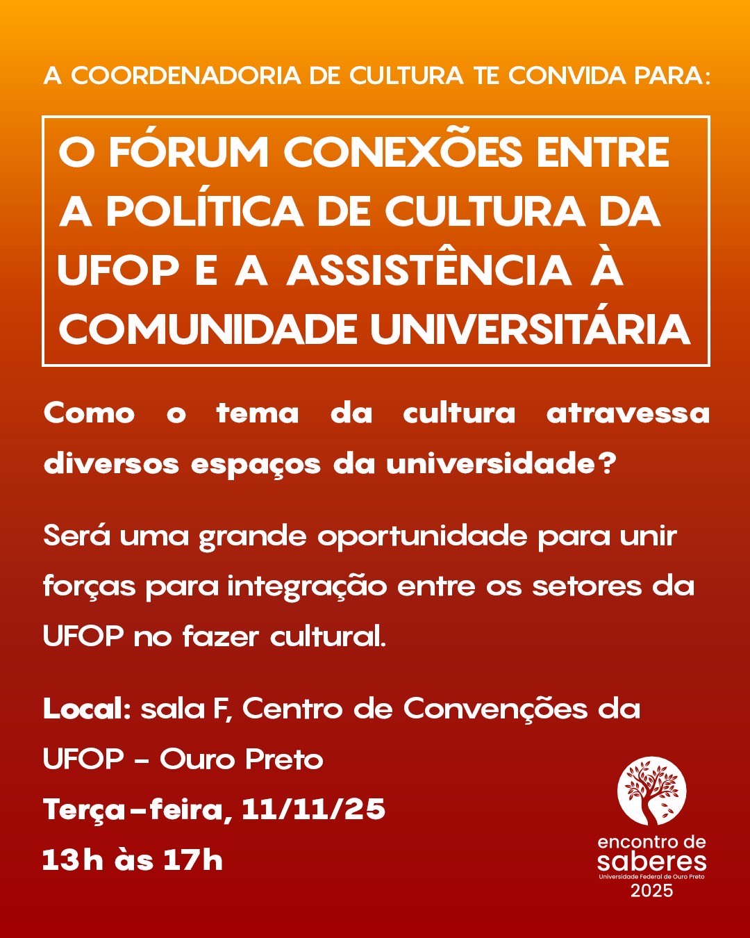 A atividade será realizada dia 11 de novembro, das 8h às 12h, no Auditório São João Del Rei, e é voltada para docentes, técnicos e estudantes interessados em refletir sobre os desafios e as possibilidades de integração da extensão nos currículos dos cursos da UFOP.